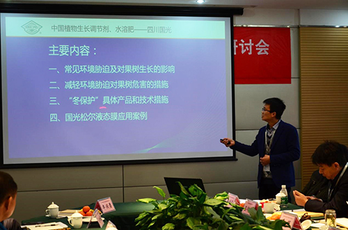 2016年12月3日,由中國農(nóng)藥發(fā)展與應(yīng)用協(xié)會植物生長調(diào)節(jié)劑專業(yè)委員會主辦,國光股份承辦的“植物生長調(diào)節(jié)劑新應(yīng)用、果樹冬保護(hù)專題研討會”在四川成都召開。全國農(nóng)業(yè)技術(shù)推廣服務(wù)中心農(nóng)藥與藥械處處長王鳳樂、中國農(nóng)藥發(fā)展與應(yīng)用協(xié)會副秘書長花榮軍、全國農(nóng)業(yè)技術(shù)推廣服務(wù)中心防治處高級農(nóng)藝師李萍、中國農(nóng)藥發(fā)展與應(yīng)用協(xié)會植物生長調(diào)節(jié)劑專業(yè)委員會主任胡興啟、中國農(nóng)業(yè)大學(xué)農(nóng)學(xué)院教授、長江學(xué)者、植物生長調(diào)節(jié)劑專家段留生以及四川、河南、山東、江蘇、陜西、福建、湖南、湖北、廣西等省的省植保站站長、省農(nóng)業(yè)科學(xué)院、林業(yè)科學(xué)院的研究員、教授等17人參加研討。