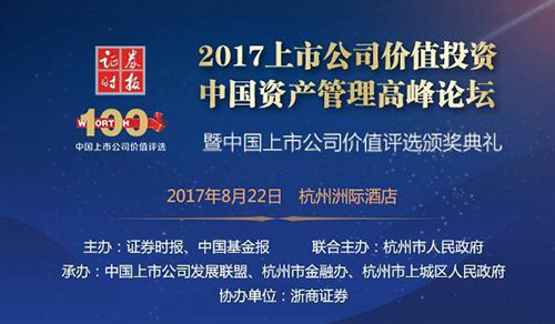 2017年8月22日,由證券時(shí)報(bào)社、中國(guó)基金報(bào)社主辦,杭州市人民政府聯(lián)合主辦,中國(guó)上市公司發(fā)展聯(lián)盟、杭州市金融辦、杭州市上城區(qū)人民政府承辦的“2017上市公司價(jià)值投資·中國(guó)資產(chǎn)管理高峰論壇暨中國(guó)上市公司價(jià)值評(píng)選頒獎(jiǎng)典禮”在杭州市洲際酒店舉行。