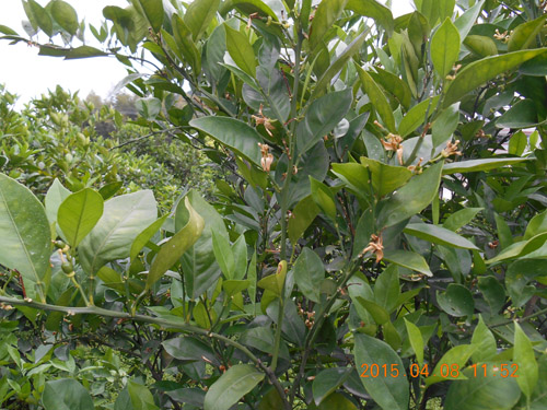2015年4月,江西省贛州市石城縣沙段村,在臍橙謝花2/3和第二次生理落果期使用兩次“國(guó)光植生源2000-2500倍+赤霉酸2000-2500倍+氨基酸水溶肥1000倍”葉面噴施,使用后的臍橙葉片深綠,光澤度好,坐果率高,果型均勻,保果效果明顯。
